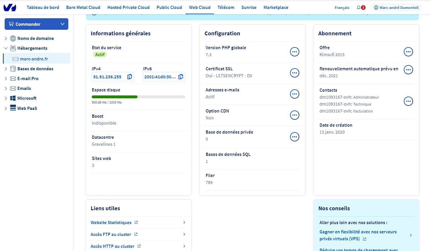 **Manager OVH > Web Cloud > Hébergement > VotreDomaine > Informations générales**