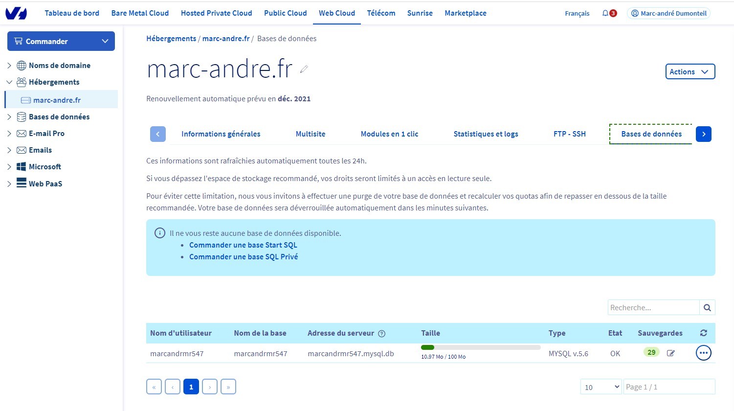 **Manager OVH > Web Cloud > Hébergement > VotreDomaine > Bases de données** :