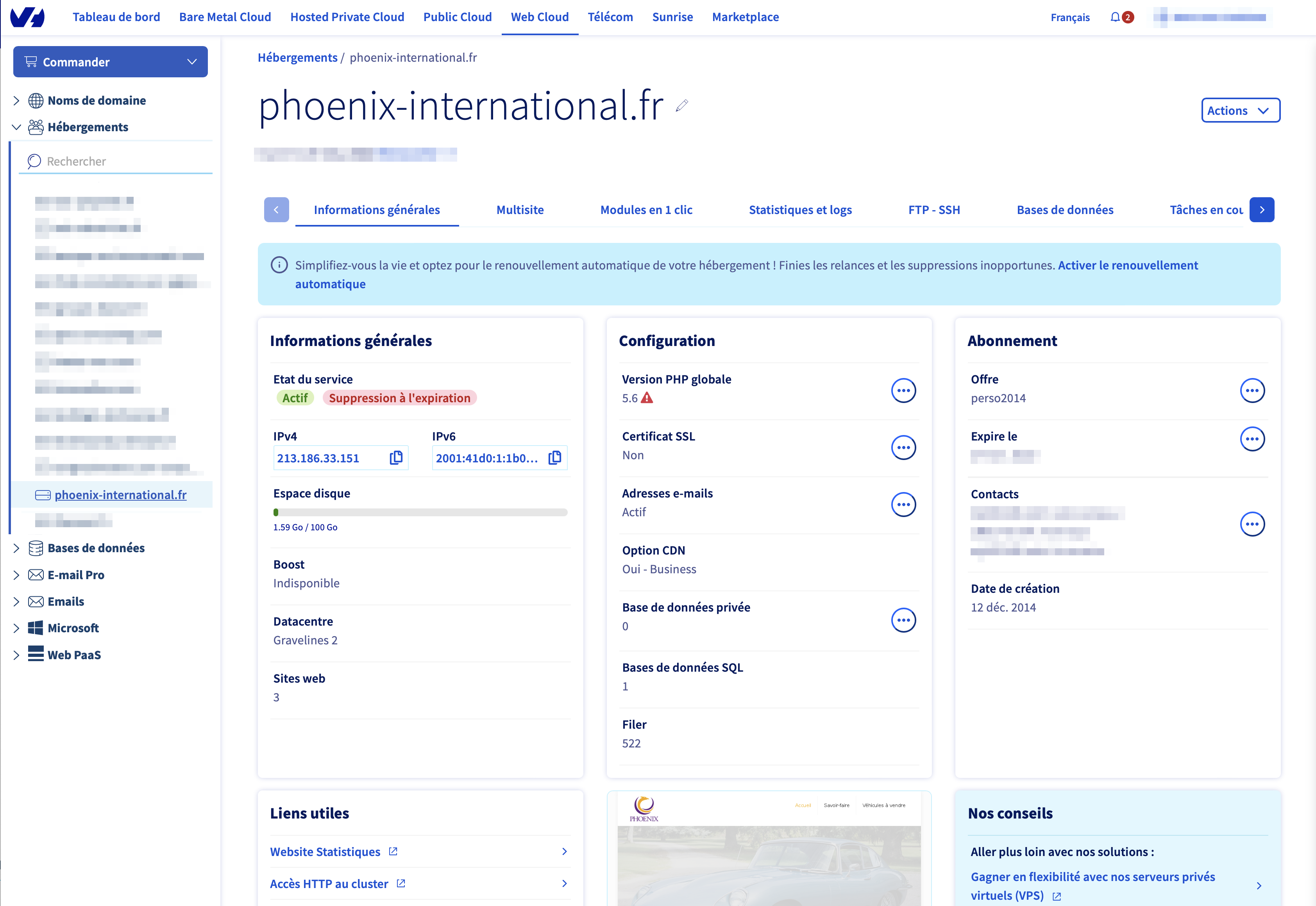 **Manager OVH > Web Cloud > Hébergement > VotreDomaine > Informations générales**
