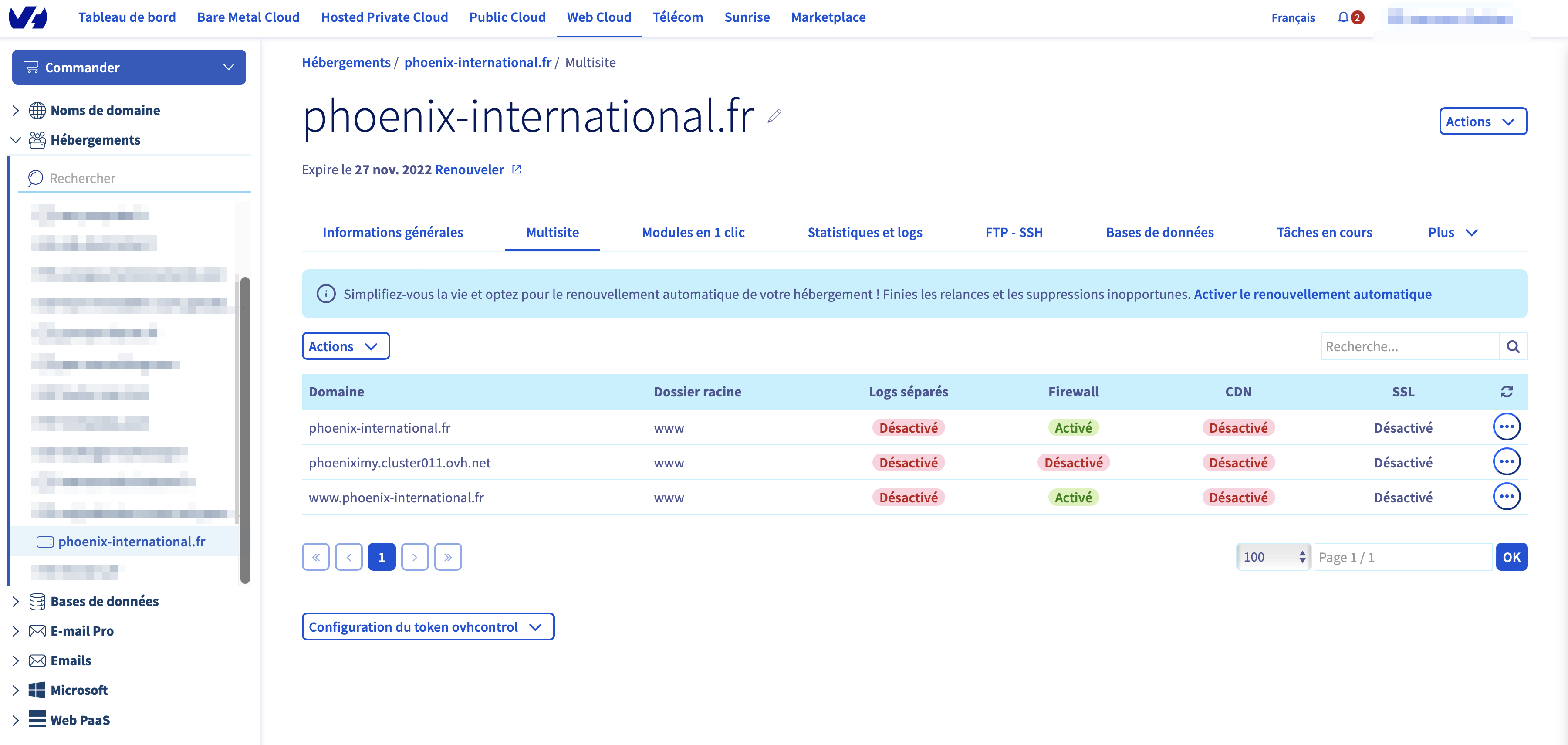 Il manque : **Manager OVH > Web Cloud > Hébergement > VotreDomaine > Multisite**