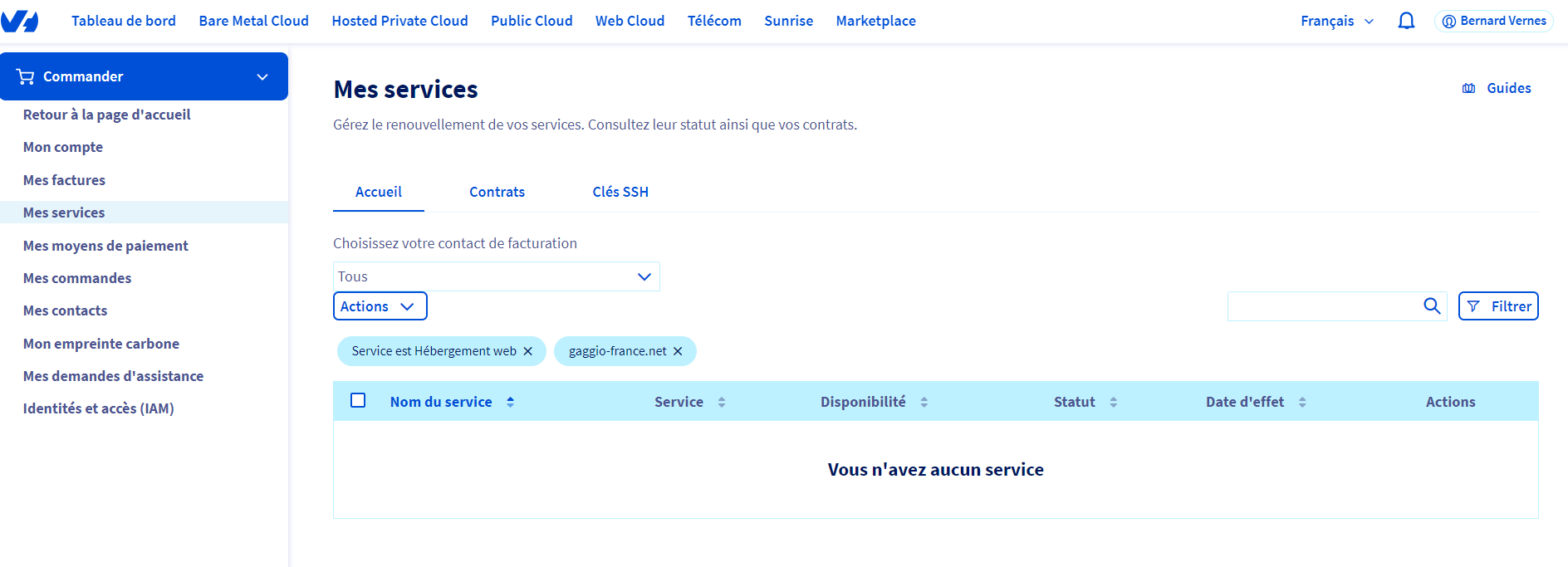 Quand je me rends sur l'hébergement résilié et que je clic sur "Renouveler", j'arrive sur l'onglet "Mes services". Cependant, sur cette page, je ne vois pas où ni comment renouveler le plan en question.