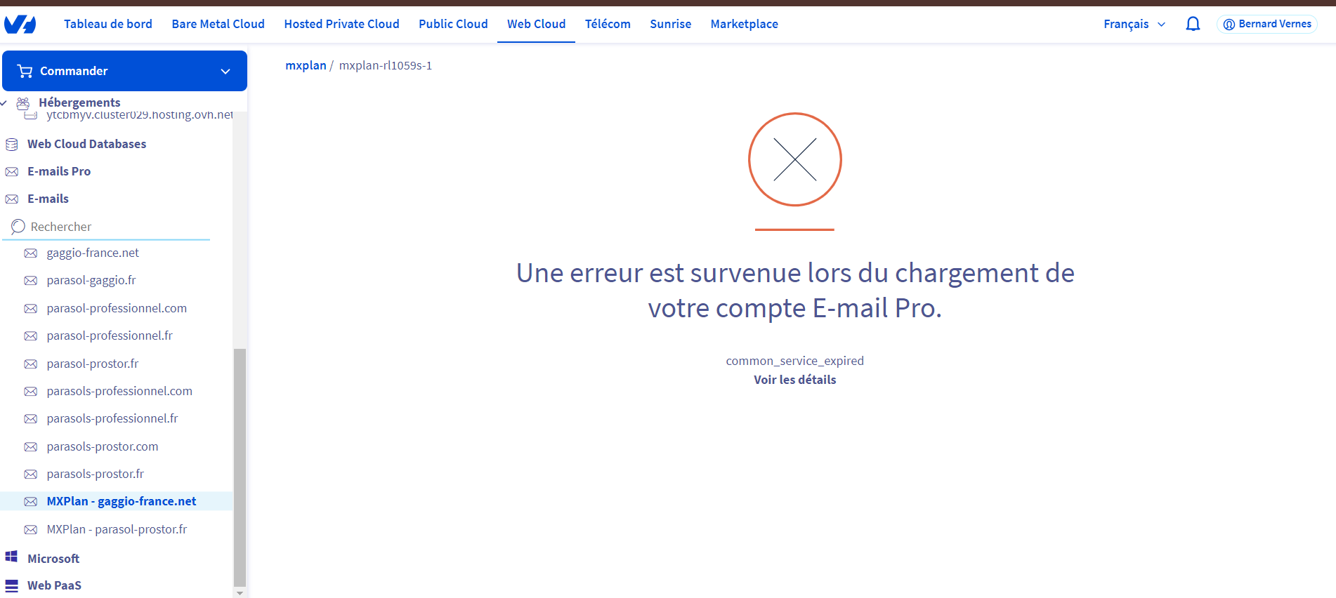 Seulement, quand depuis l'hébergement en question je clique sur "Activer mon adresse email", puis parmi les domaines proposés dans la liste déroulante je sélectionne "gaggio-france.net", j'ai l'erreur suivante qui s'affiche : **_"Order not possible. A MX for 'gaggio-france.net' already exists"_**
