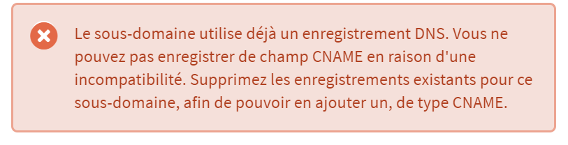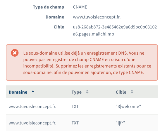 je rencontre exactement le même problème avec le même message d'erreur. Il semblerait que ce soucis soit dû au fait que d'autres "enregistrements existant pour ce sous-domaine" existent en TXT. Doit-on les modifier ou les supprimer ?