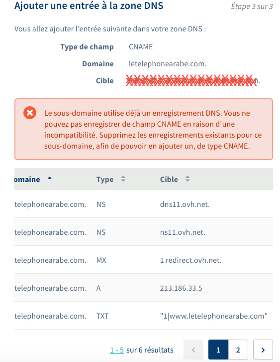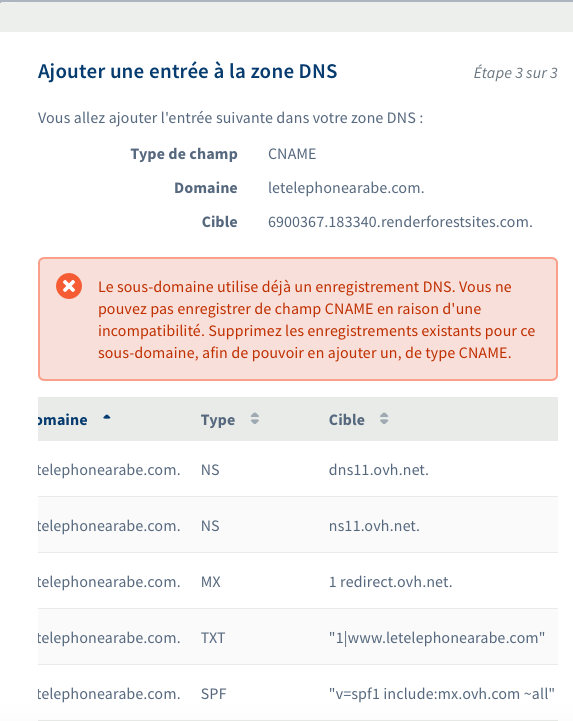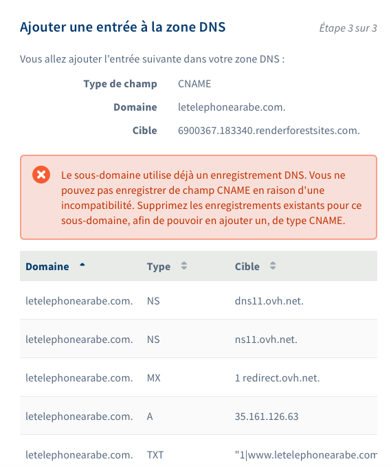 J'ai un nom de domaine OVH. J'ai crée un siteweb via une autre plateforme et je voudrais rattacher le site au nom de domaine. Je dois normalement ajouter un CNAME mais lorsque j'essaie j'ai ce message :