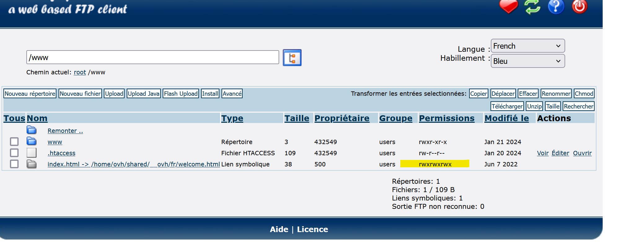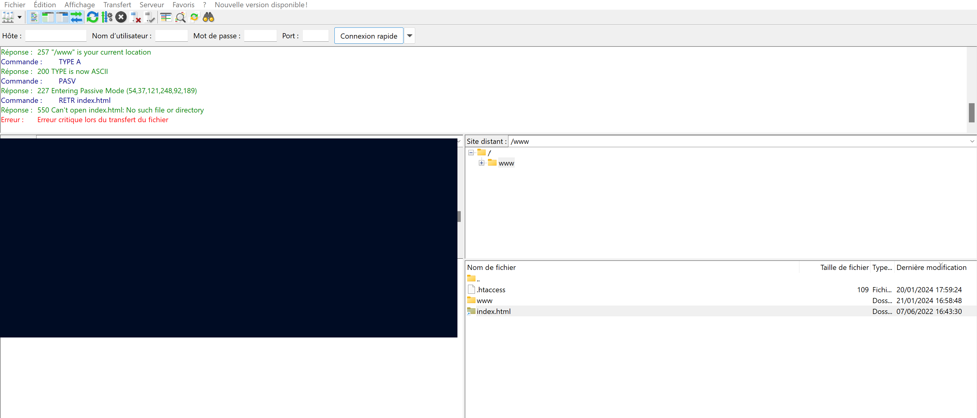 Je rencontre un problème pour récupérer les fichiers de mon site internet hébergé chez OVH. Je n’arrive pas à accéder au fichier /www/index.html via le gestionnaire de fichiers. De plus, en me connectant via le FTP, comme indiqué sur la photo ci-jointe, je n’ai rien trouvé.