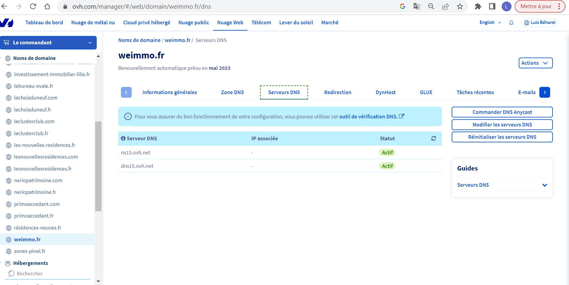**Manager OVH > Web Cloud > Domaine > VotreDomaine > Serveurs DNS**