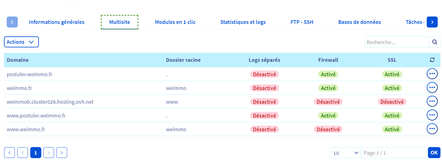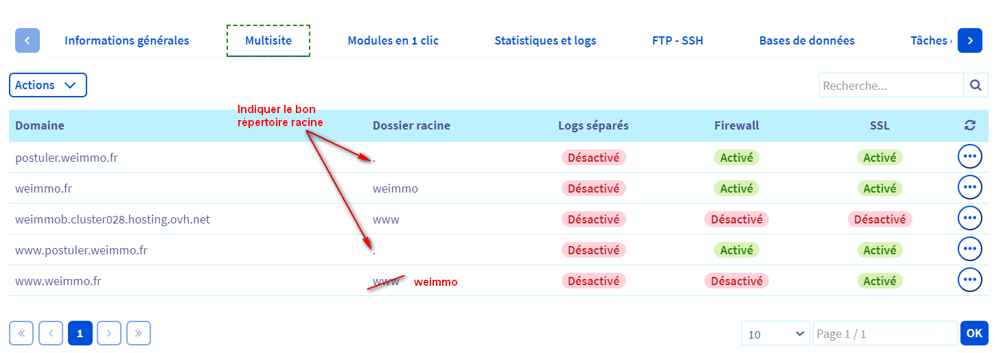 **Manager OVH > Web Cloud > Hébergement > VotreDomaine > Multisite**