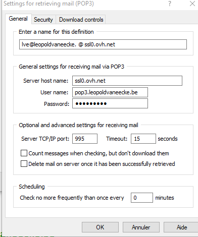J’entre les données suivante pour le serveur pop3.