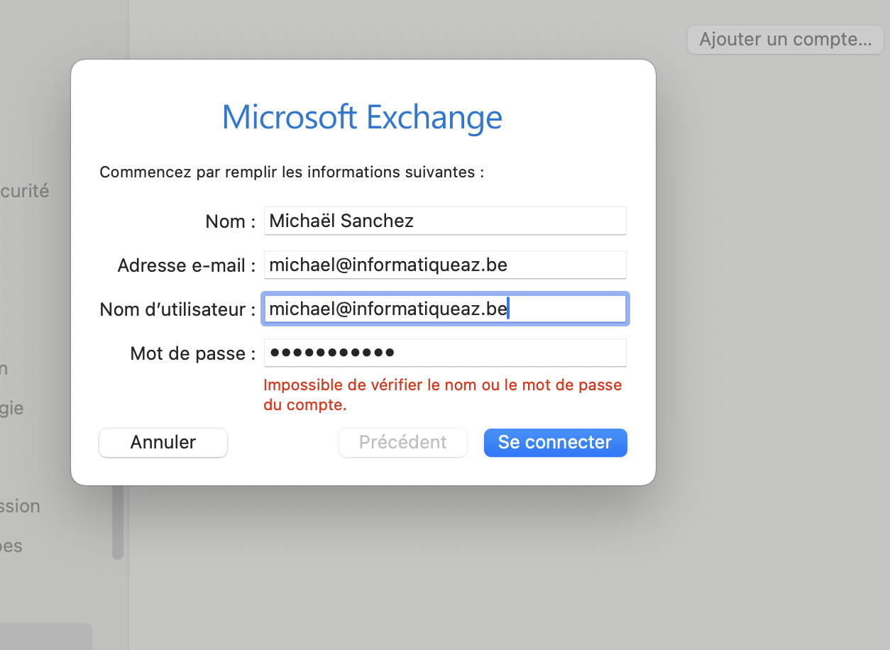 Bonjour ! Besoin de votre aide. J'ai dû ré-installer mon email Exchange sur mon MAC, dans l'application MAIL. J'ai bien le bon mot de passe mais j'ai un message d'erreur qui revient : "impossible de vérifier le nom ou le mot de passe du compte" et dans la fenêtre il me demande d'indiquer les URL interne et externe. Je suis perdue. Rien ne marche...Merci de votre aide ! Caroline