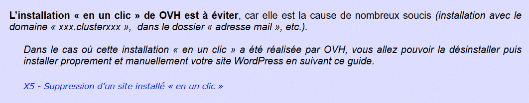 Après lecture du forum, j'envisage aujourd'hui de désinstaller le module en 1 clic et de réinstaller WP manuellement en suivant le guide WORDPRESS - Guide d'installation de WORDPRESS dans un hébergement PERSO chez OVH de Gasston mais qqch me turlupine :
