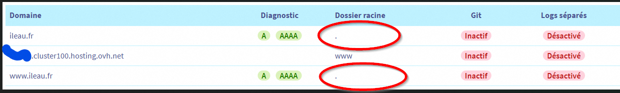 Dans l'onglet multisite de mon hébergement d'OVH, www , dossier racine, n'est pas actif sur mon domaine ileau.fr et www.ileau.fr mais sur nombdd.cluster100.hosting.ovh.net (voir extrait en PJ) ? est-ce bien configuré selon vous ?