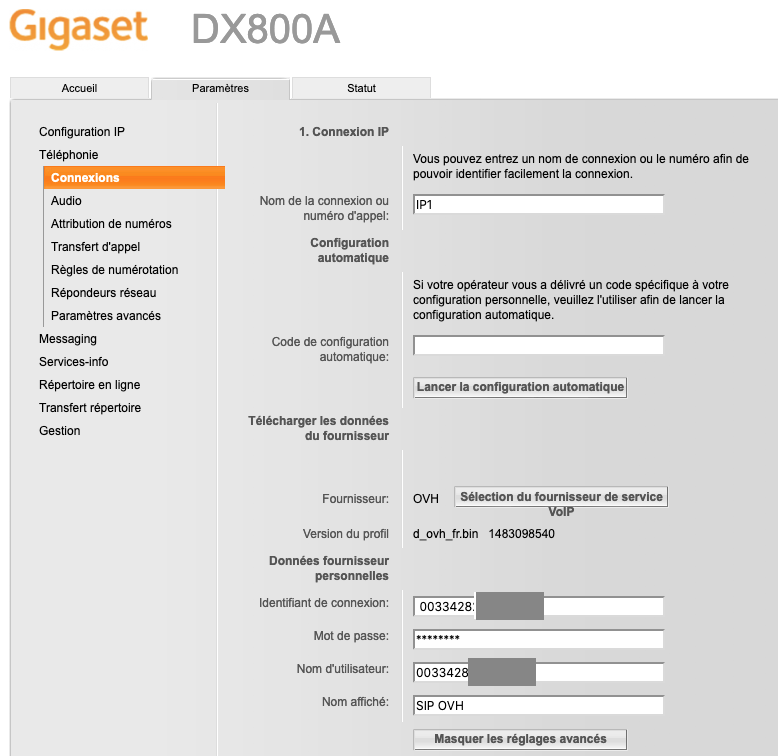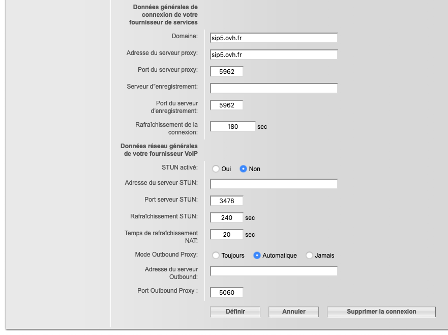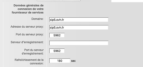 J'ai tout repris avec comme modèle le telephone qui a été configuré. J'ai donc en plus des identifiants rajouter les renseignements du type sip5.ovh.fr.