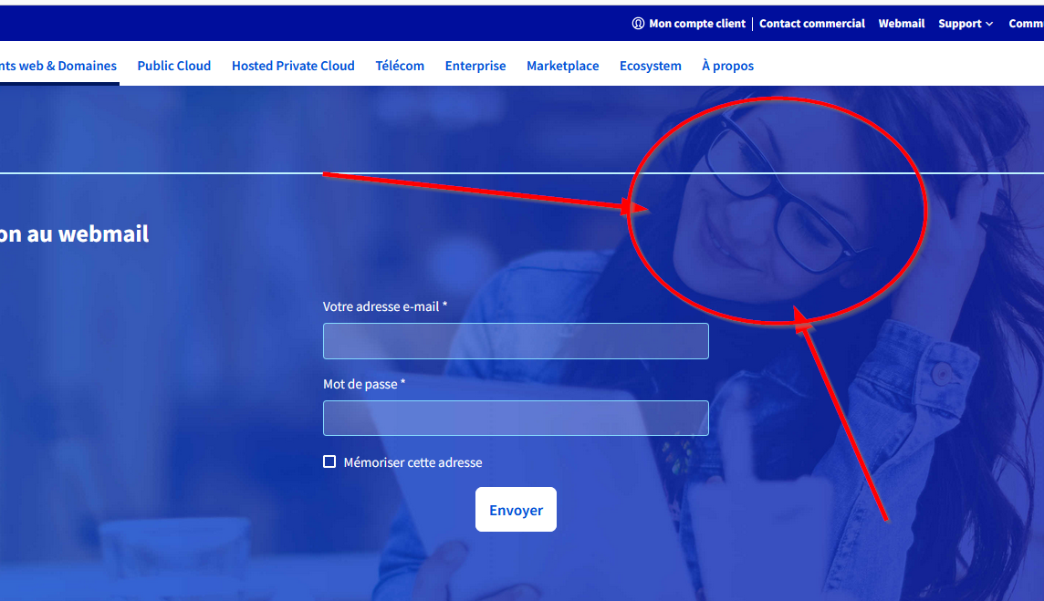 Et ma question sur le webmail est-il possible d'avoir une réponse ? Le webmail est bien, il n'y a pas de problème, mais pour y accéder je dois avoir une page de connection avant et remplir l'email et son mot de passe et sur cette page de connexion, il y a un background avec une employée OVH. Pareil avant d'accéder à cette page, je dois passer par le site OVH donc faire une connection prélable, avec tous les services qui s'affichent, pub et autre.