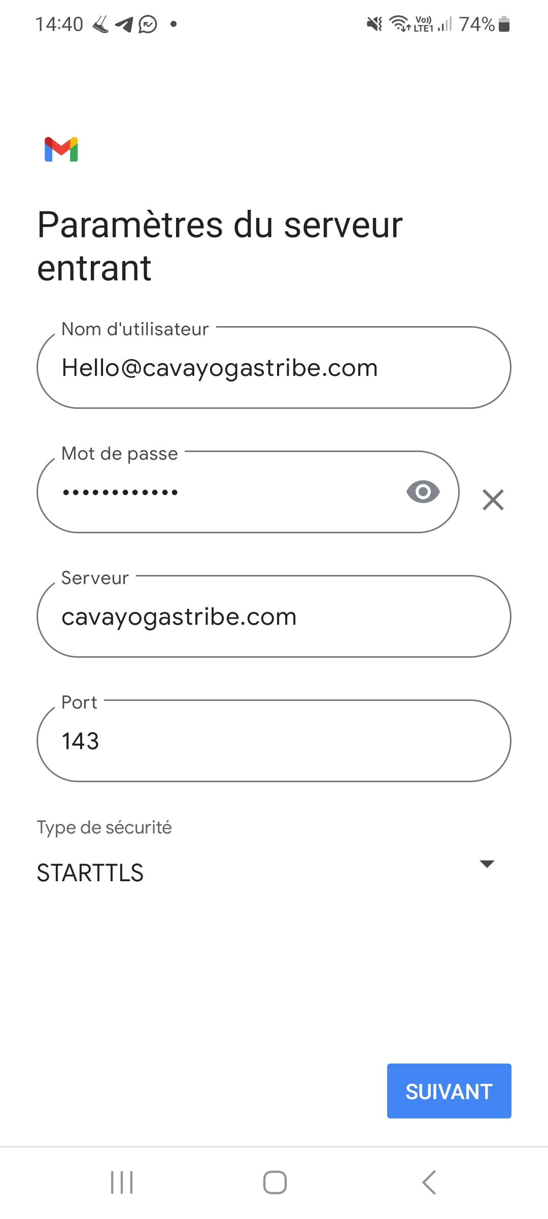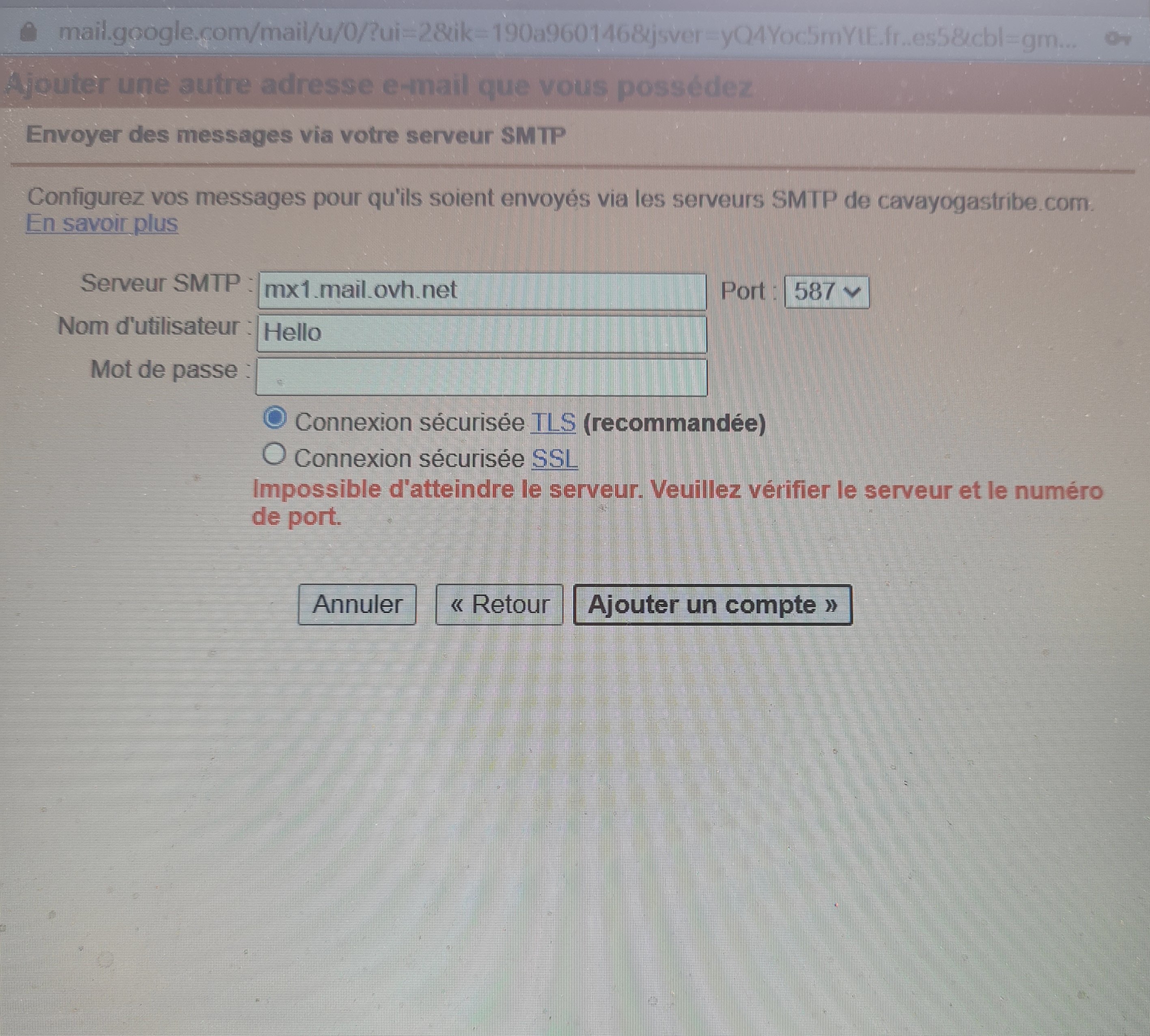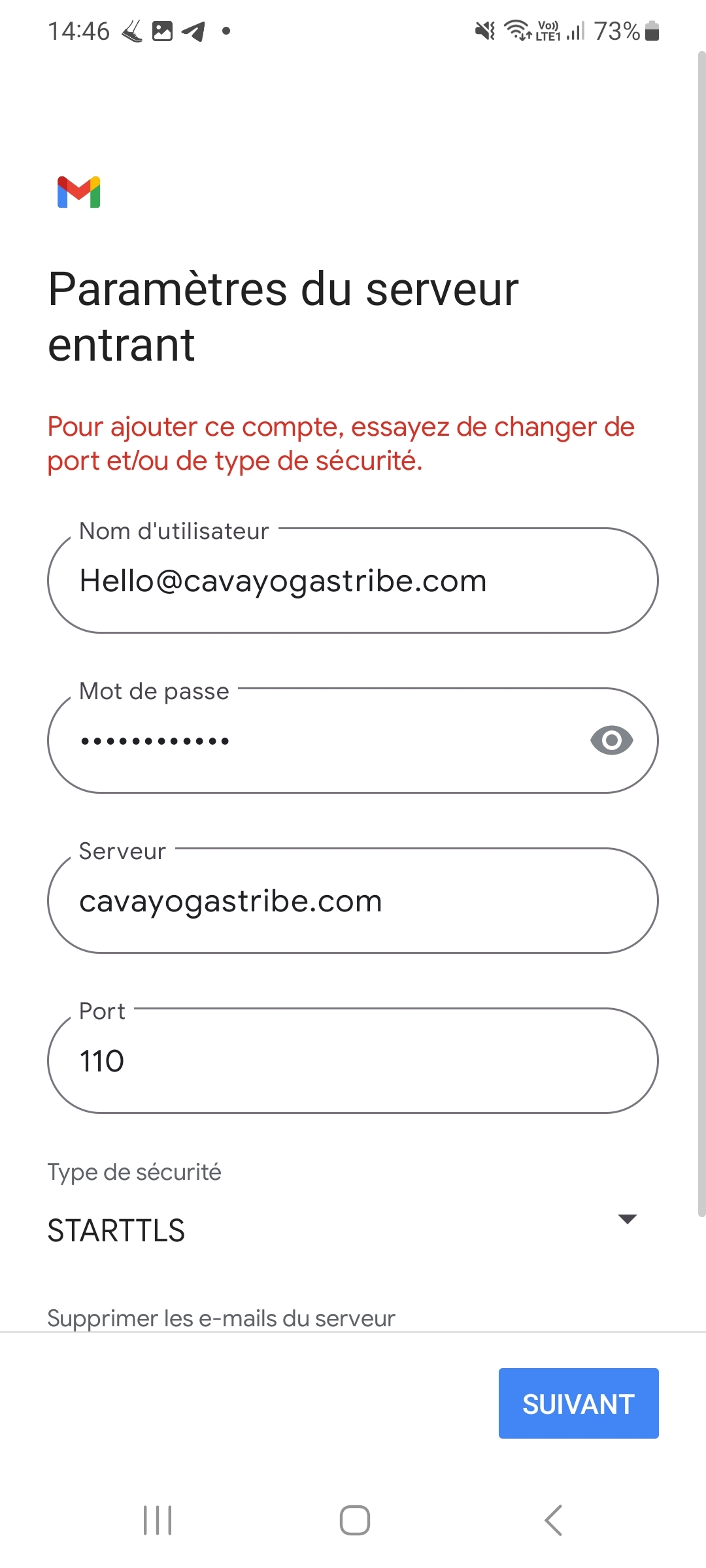 - sur smartphone Android: "pour ajouter ce compte, essayer de changer de port et/ou type de sécurité" : si je change de type de sécurité au hasard (je n'y connais rien!), j'ai le message comme quoi le serveur n'est pas joignable.