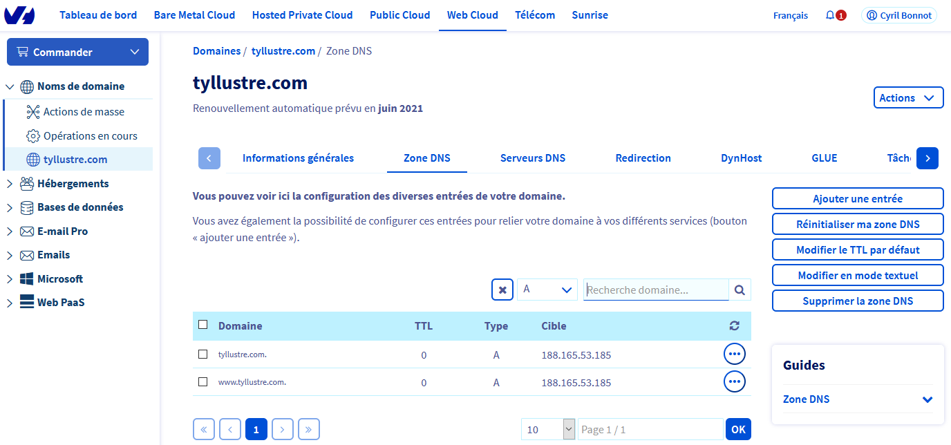 **Manager OVH > Web Cloud > Domaine > VotreDomaine > Zone DNS**