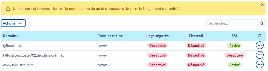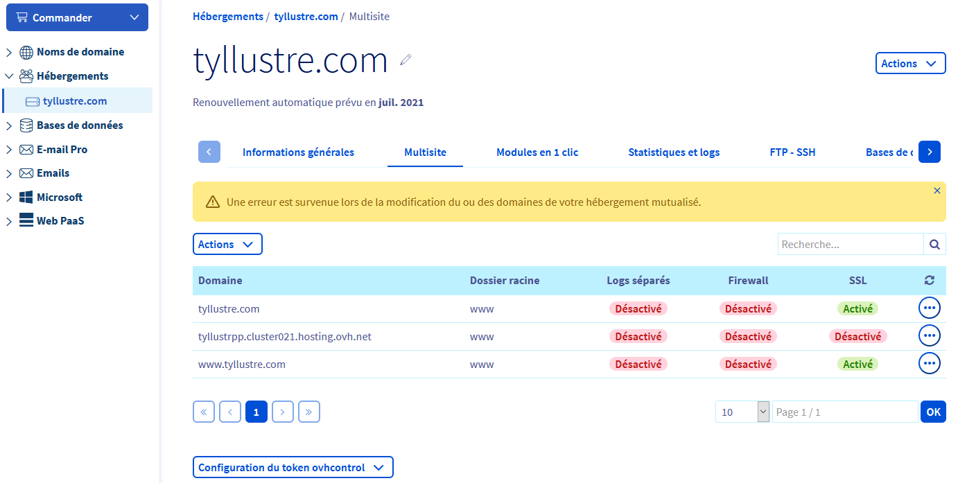 **Manager OVH > Web Cloud > Hébergement > VotreDomaine > Multisite**