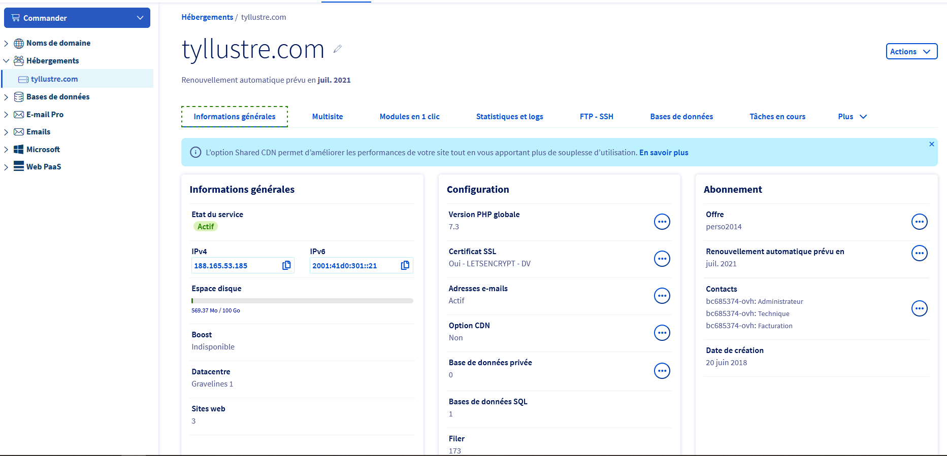 **Manager OVH > Web Cloud > Hébergement > VotreDomaine > Informations générales**