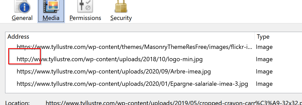Pour l'image en http:, je l'ai retrouvée sur mon wp-admin mais son adresse commence par https... étrange.