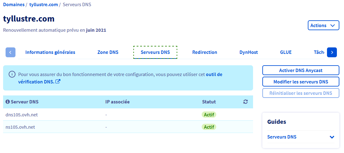 **Manager OVH > Web Cloud > Domaine > VotreDomaine > Serveurs DNS**