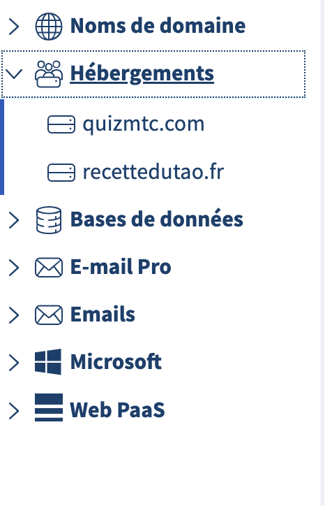 Ci-joint les copies d'écran demandées, avec le souci que mon nom de domaine n'est pas hébergé sur ovh (il n'apparait pas dans hébergements dans le menu de gauche, comme l'indique la copie d'écran et rien non plus dans les multisite de recette du tao et de quizmtc).