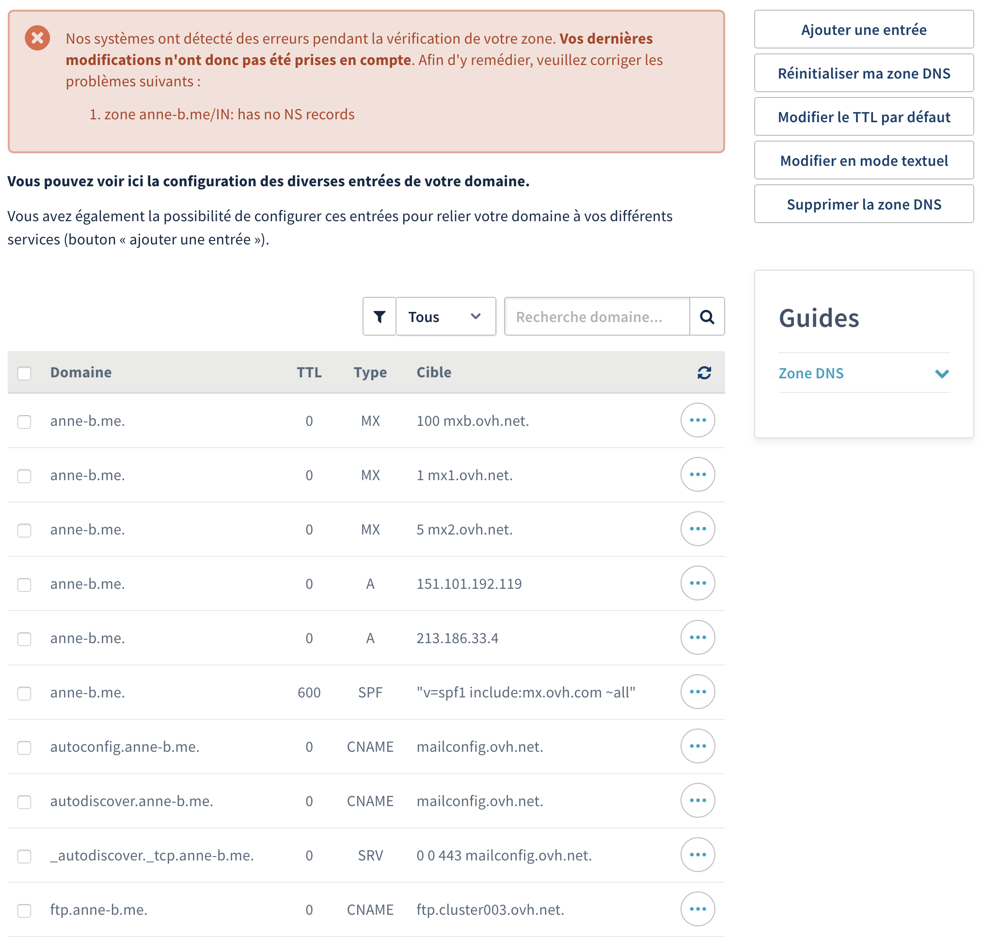 J'ai fait une recherche sur le sujet et suivi les indications des conversations résolus, mais j'ai du faire une erreur... J'avoue ne pas être une experte ! Sur mon Ovh manager --> Zone DNS j'ai un message d'erreur :