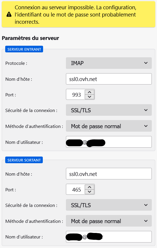 Sur vos conseils, j'ai téléchargé Thunderbird, j'ai tenté de configurer mon adresse mail en suivant la procédure OVH, mais voici le message :