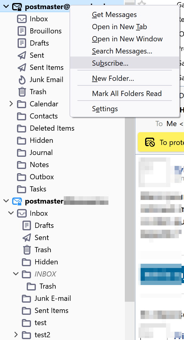Pour voir la liste des mails dans un dossier, clic-droit sur la boîte, et "Souscrire à".