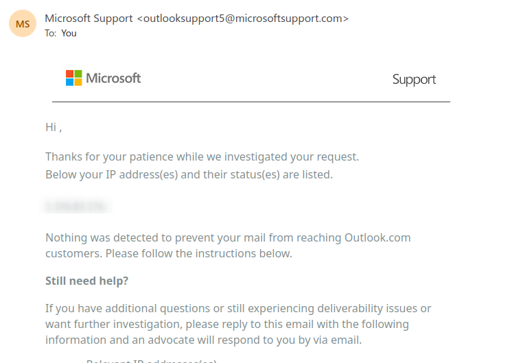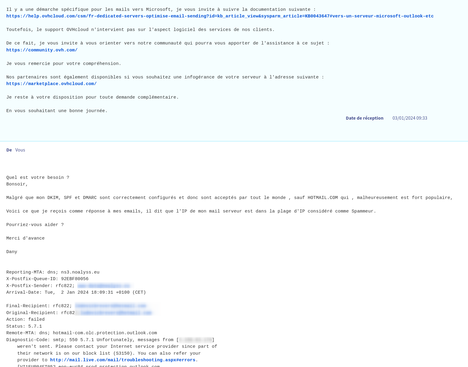 non si blacklist ISP le support OVH doit le faire suivre à la bonne équipe en interne pour faire les vérifications auprès de Microsoft.