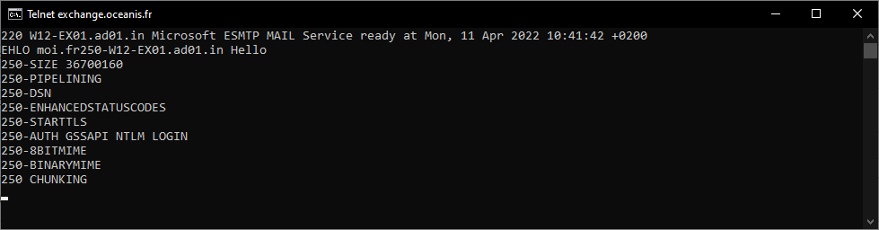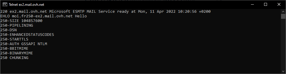 2022-04-07 08:43:03 SERVER -> CLIENT: 1ex5.mail.ovh.netex5.mail.ovh.net Hello [51.68.11.215]250-SIZE 104857600250-PIPELINING250-DSN250-ENHANCEDSTATUSCODES250-STARTTLS250-AUTH GSSAPI NTLM250-8BITMIME250-BINARYMIME250 CHUNKING