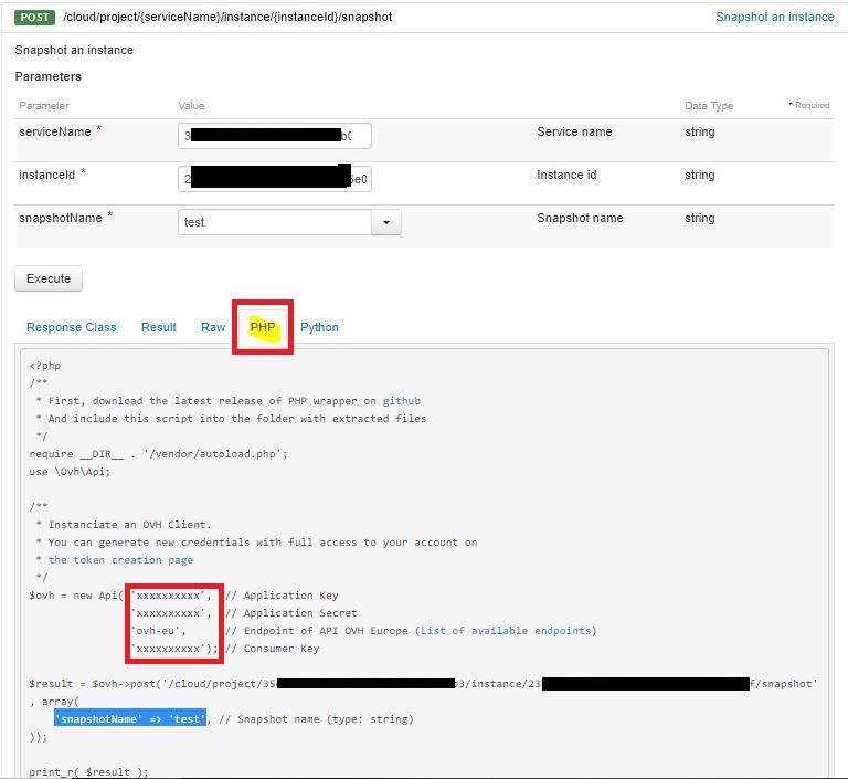 J'aimerais rendre automatique l’exécution d'une API OVH, plus précisément celle-ci : https://api.ovh.com/console/#/cloud/project/%7BserviceName%7D/volume/%7BvolumeId%7D/snapshot#POST