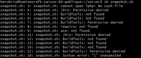 De base le script je lui avais donné pour extension .php soit "snapshot.php". J'ai donc essayé de lui donner l'extension .sh et cette fois j'ai une autre erreur :
