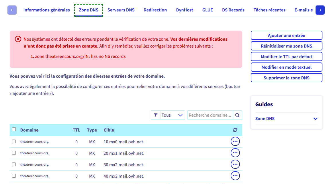 1 - Dans la zone DNS, j'entre les valeurs mx ovh 0,1,2,3
