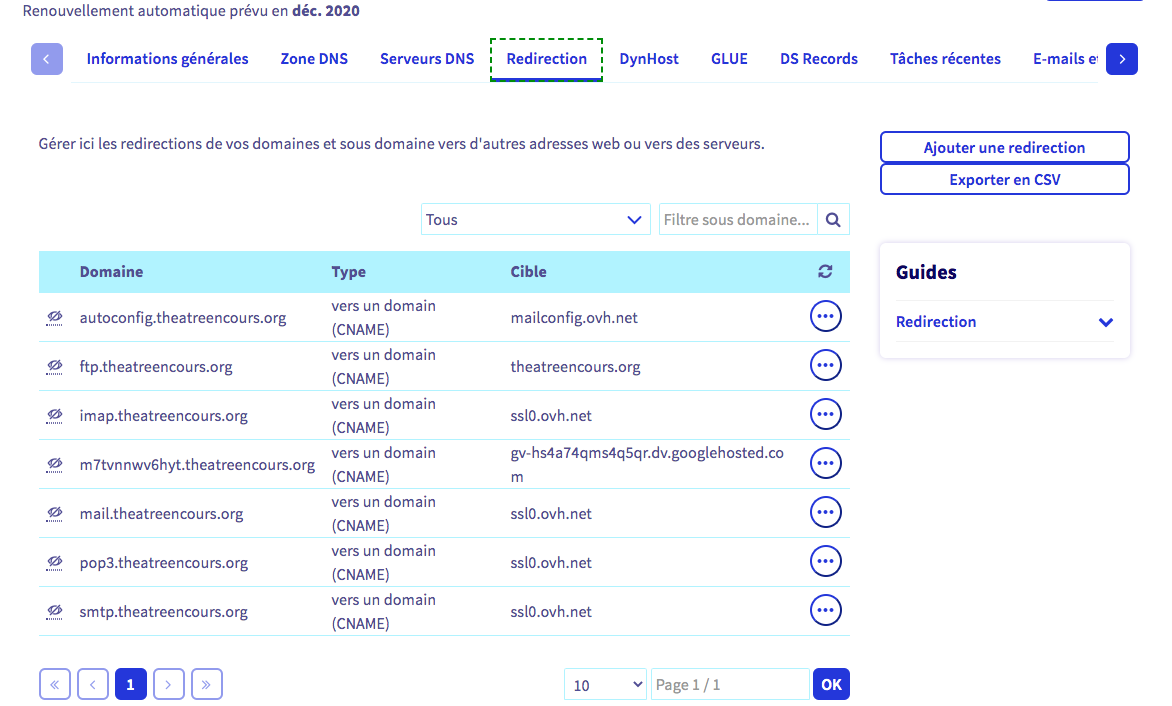 > l'ennemix) j'avais 2 adresses theatreencours.org, inscrites sur ovh, qui renvoyaient vers gmail ET 2 autres adresses
