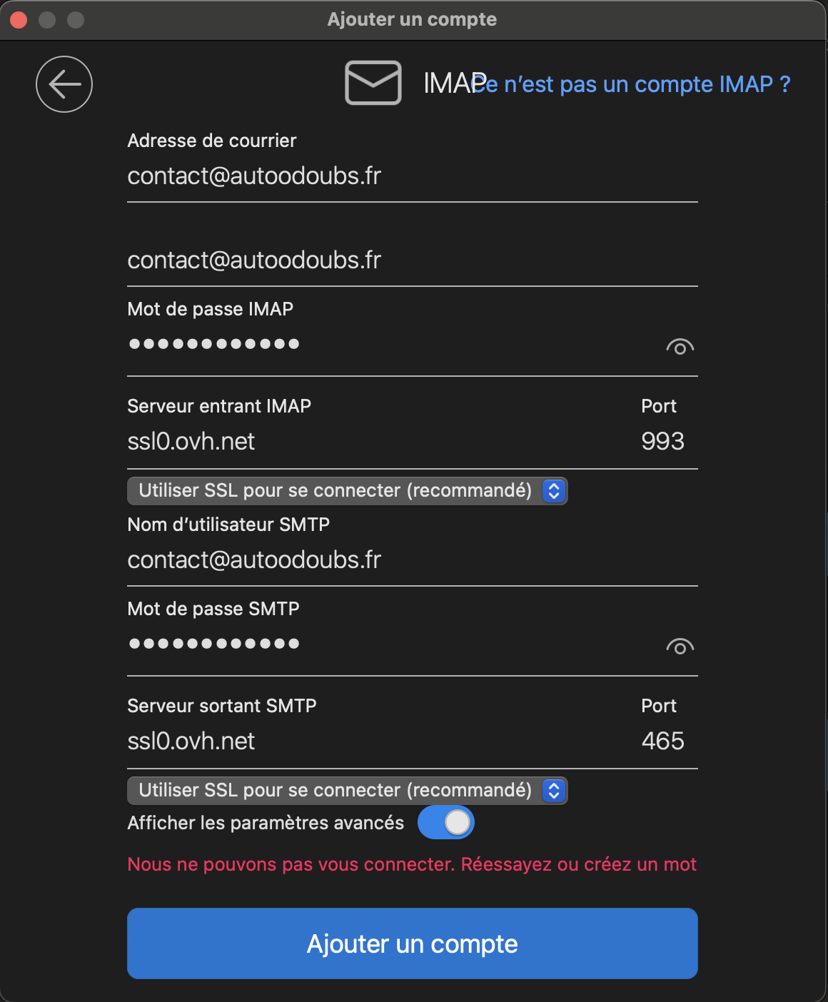 Impossible de configurer mon adresse mail sur Outlook MAC et ANDROID