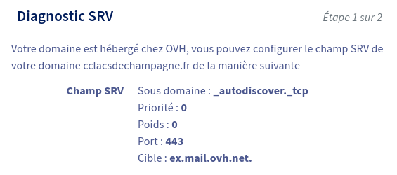 Pour ceux qui auraient le même problème, voici ce que j'ai fait. Suite aux remarques de Fritz2cat sur le SRV, je suis allé sur mon espace client OVH dans le panneau microsoft Exchange. J'ai cliqué sur "Domaines associés" et ensuite, dans la colonne diagnostique, j'ai cliqué (par curiosité :) ) sur SRV. Là, OVH m'a proposé de configurer le SRV comme indiqué sur la capture d’écran un peu au dessus. Avant le champ sous domaine était vide, OVH a ajouté _autodicover._tcp.