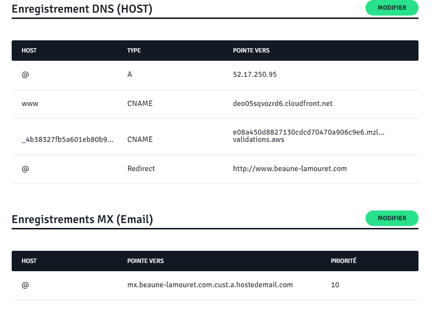 Je ne comprends vraiment pas votre réponse et pourquoi vous vous énervez. Je ne sais même pas ce que j'ai fait de mal. Pour rappel, je ne suis pas informaticienne, j'ai juste repris le secrétariat d'une menuiserie et j'ai essayé de me débrouiller. Donc notre nom de domaine est géré par OVH, notre adresse mail principale contact@1lamouret.netlamouret.net est herbergée chez Microsoft. Lorsqu'on a perdu notre site internet une première fois car la société qui le gérait a fait faillite, j'en ai recréé un sur Webself pour être certaine d'avoir la main dessus et on a repris une adresse mail contact@1lamouret.com,lamouret.com, chez Webself en parallèle, pour avoir une adresse mail secondaire. Donc, pour moi, tout ça n'a rien à voir avec OVH et mon problème actuel que je pensais résolu depuis ce matin mais c'est vous qui me posez des questions sur le site internet. Maintenant, si je peux vous donner d'autres informations qui pourraient éclaircir tout ça, n'hésitez pas.