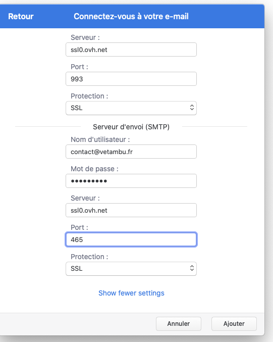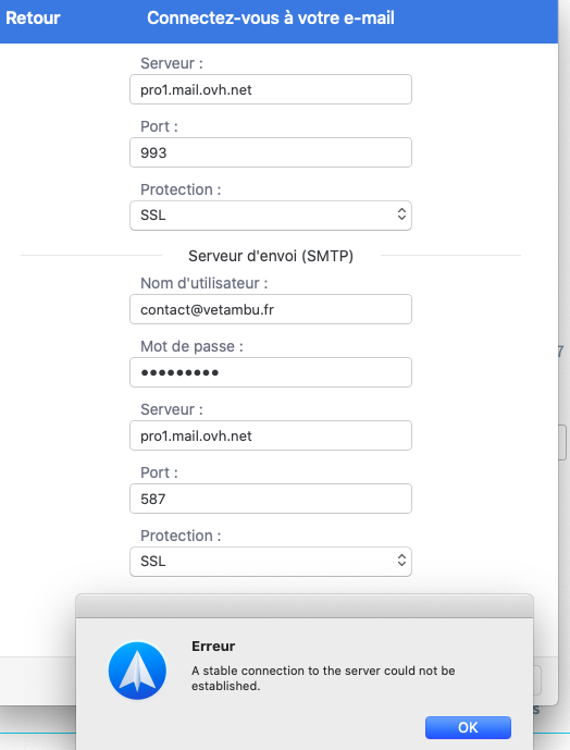 J'essaye de me connecter au SMTP pro1.mail.ovh.net pour envoyer mes mails.