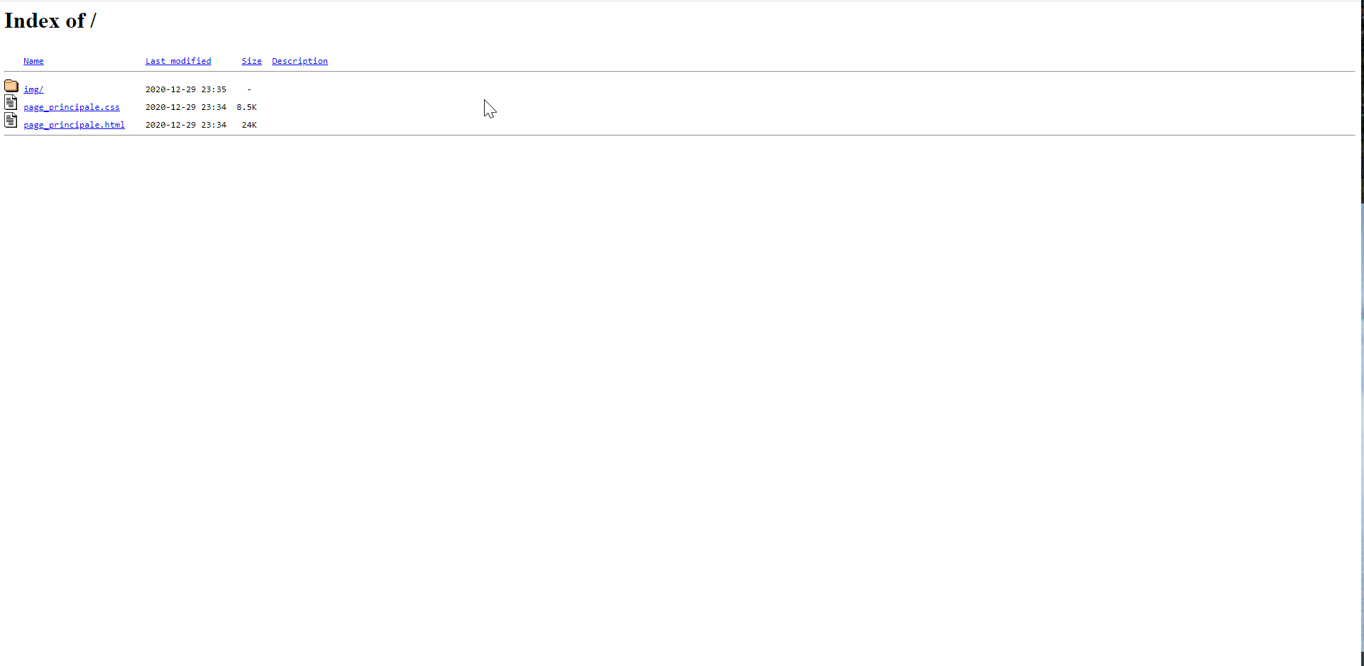 Cependant, lorsque je saisi le lien de mon site, je me retrouve sur une page "index of" avec mes fichiers html, css et mon dossier img tel un explorateur de dossier.