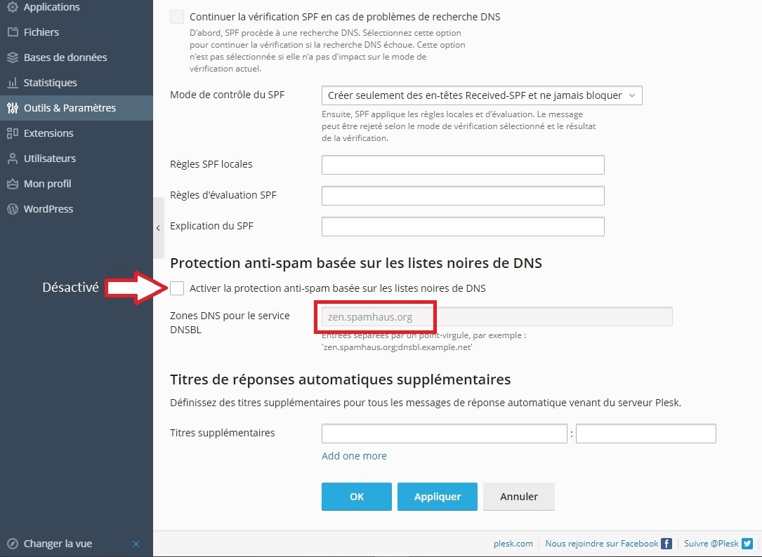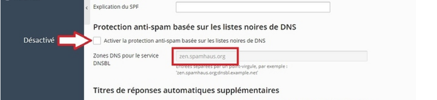 La protection anti-spam basée sur les listes noires de DNS dont je parlais ci-dessus concerne les paramètres de la messagerie pour l'ensemble du serveur que je gère : ça concerne donc les emails.