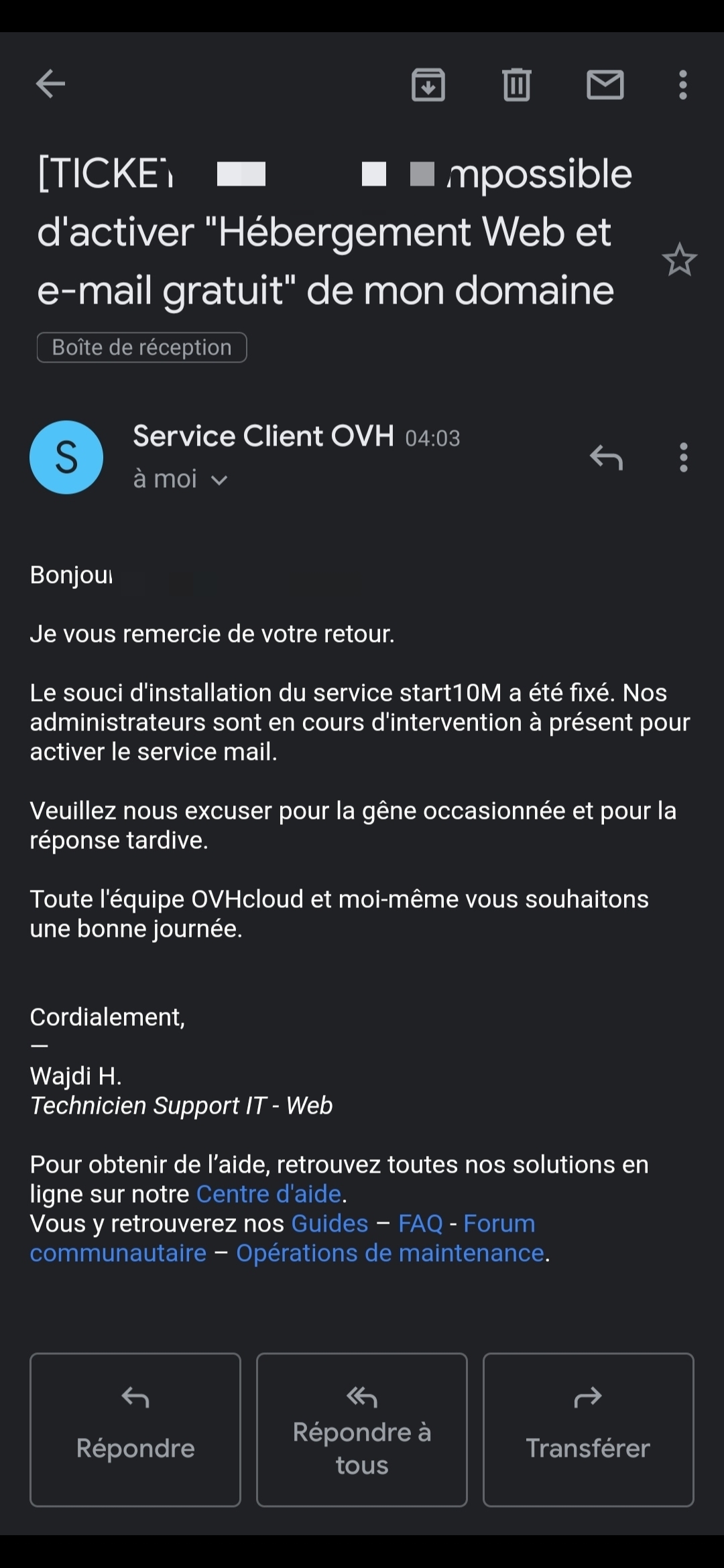 Cela fait plus d'une semaine que j'ai contacté le support, aucune solution et aucune aide apportée. OVH ne semble pas vouloir traiter ce problème de sitôt, en voyant sur le forum que certains ont ce problème depuis bientôt 1 mois. Malheureusement, la solution qui s'offre à nous si nous sommes pressés de vouloir accéder à nos e-mails, c'est d'opter pour un plan MX payant.