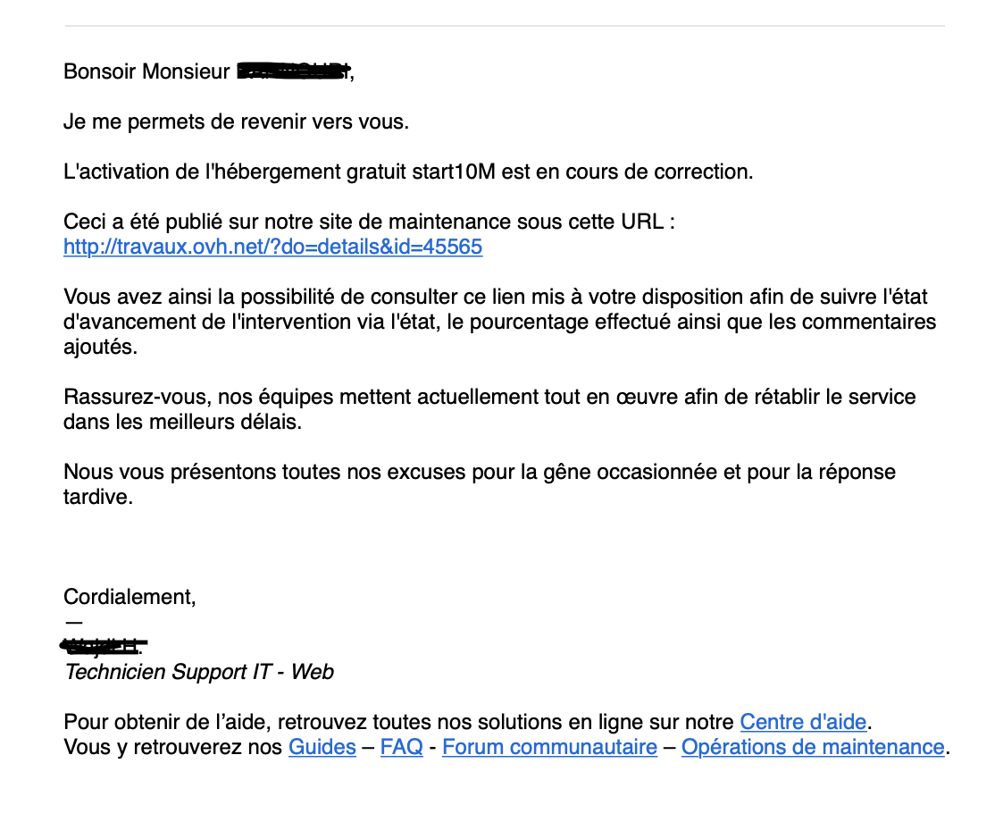 dommage qu'il n'y ait aucun progrès ni de date de départ, ils se mettent pas la pression chez ovh