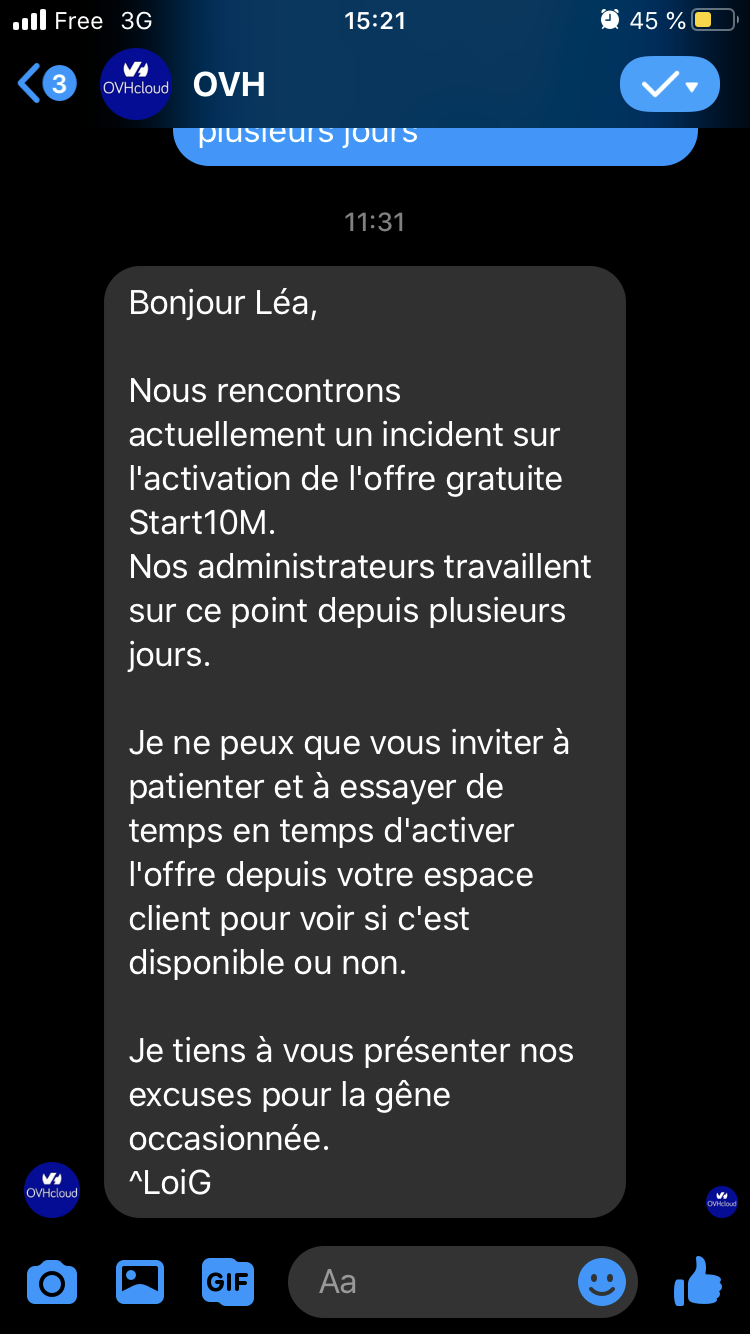 Oui @kyodev , mais c'est un peu énervant parce que j'ai justement transféré mes noms de domaines pour bénéficier de ces emails gratuits. J'ai dit dans mon ticket que de toute façon il n'était pas question que je cède et que j'achète un plan MX, et que si je n'avais pas mon hébergement start10M avec les e-mails très bientôt, alors je réaliserai le transfert de mes 2 domaines vers mon ancien registrar, qui lui ne faisait pas ce genre de chantage !!