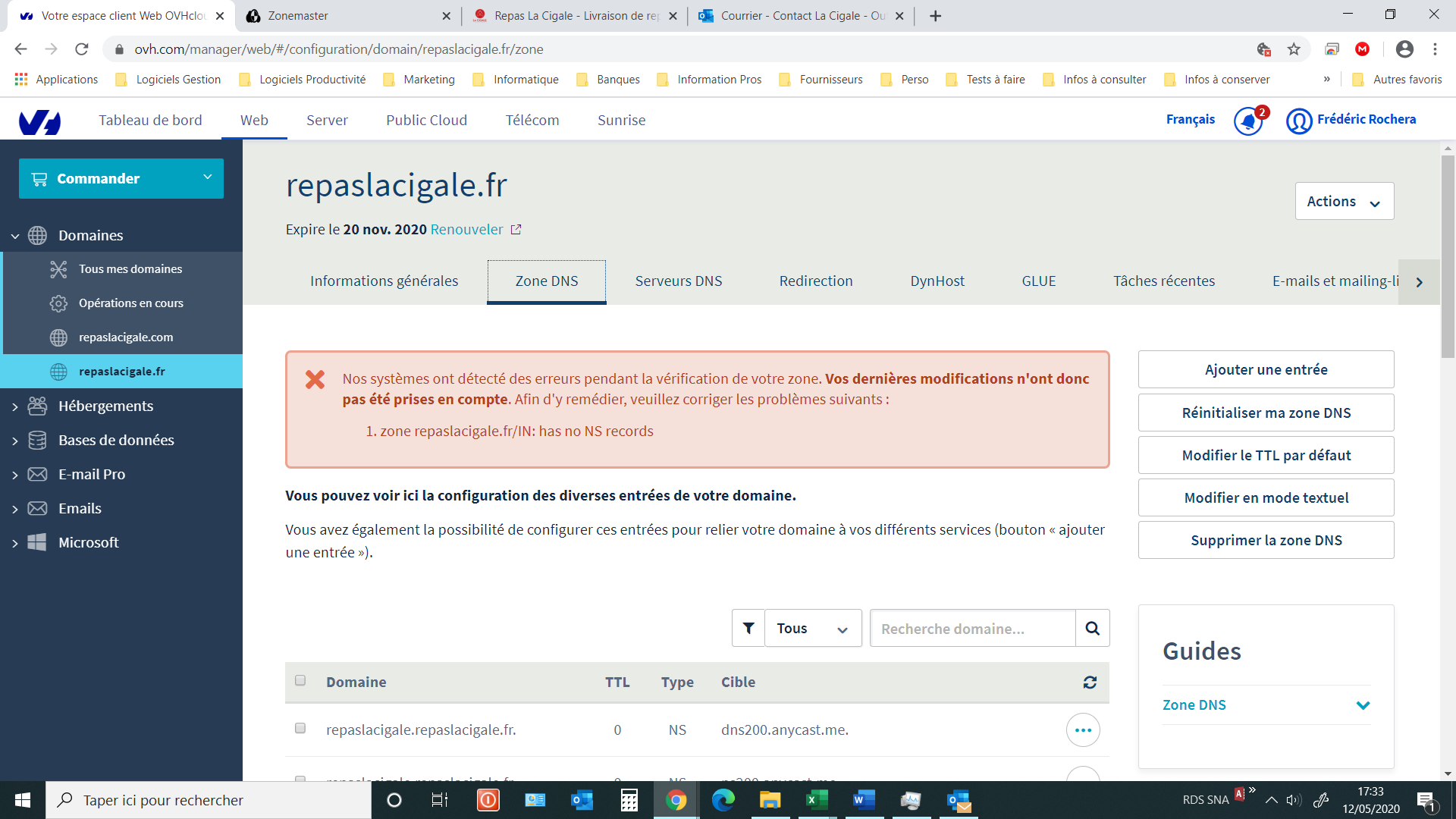 "Nos systèmes ont détecté des erreurs pendant la vérification de votre zone. Vos dernières modifications n'ont donc pas été prises en compte. Afin d'y remédier, veuillez corriger les problèmes suivants :
