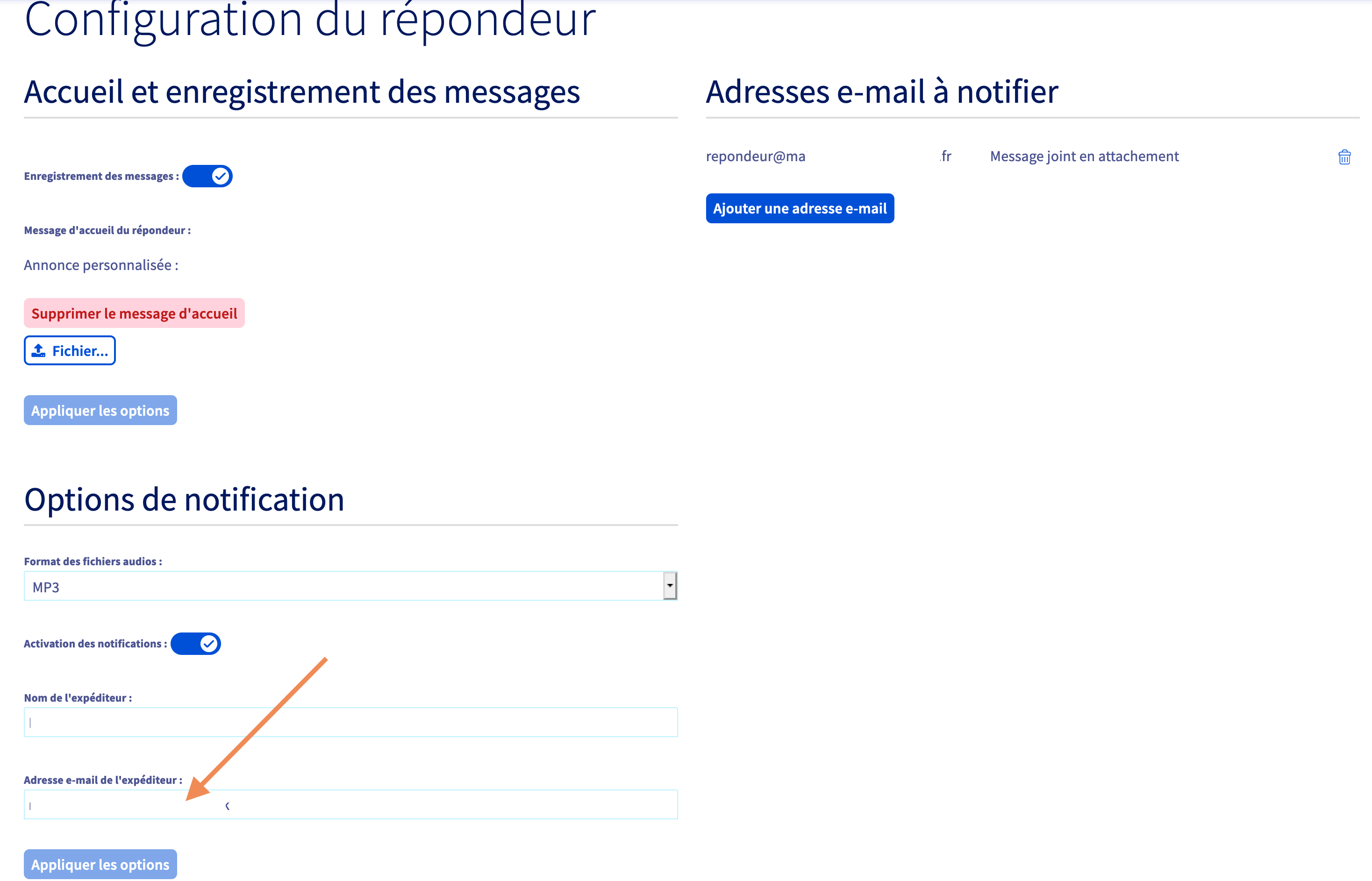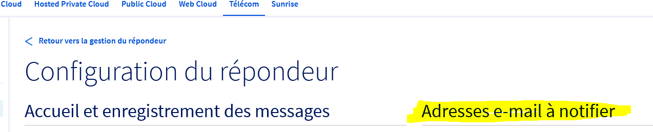 Téléphonie > Compte AA111-OVH > SIP 0033xxxx > Répondeur > Configuration du répondeur > Adresses e-mail à notifier.