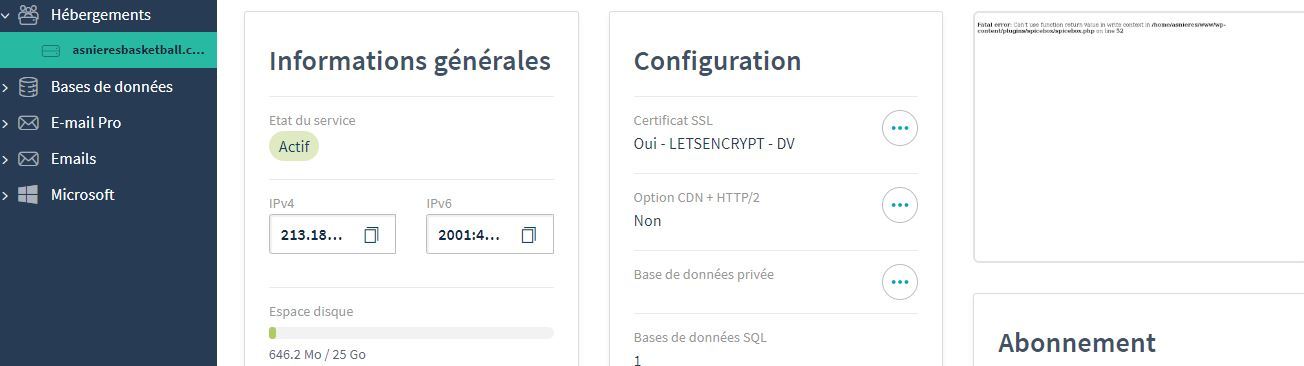 Le probleme c'est que je ne comprends rien à tout cela mais apparamment cela aurait à voir avec une mise a jour PHP que je n'aurais pas faite. J'ai 70 ans, je ne sais pas comment cela fonctionne. Quelqu'un pourrait-il m'aider ? Merci beaucoup