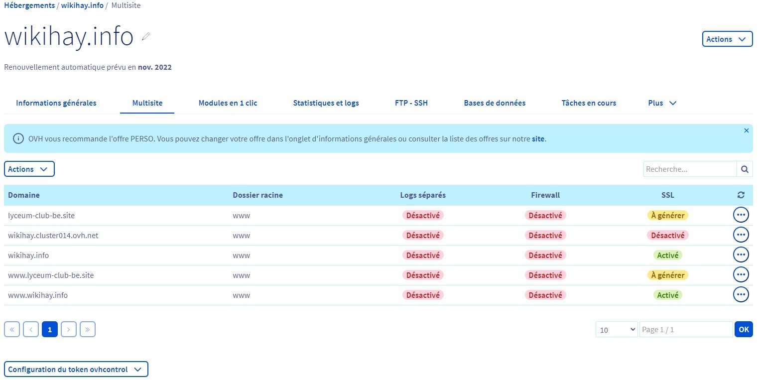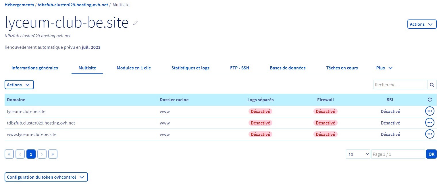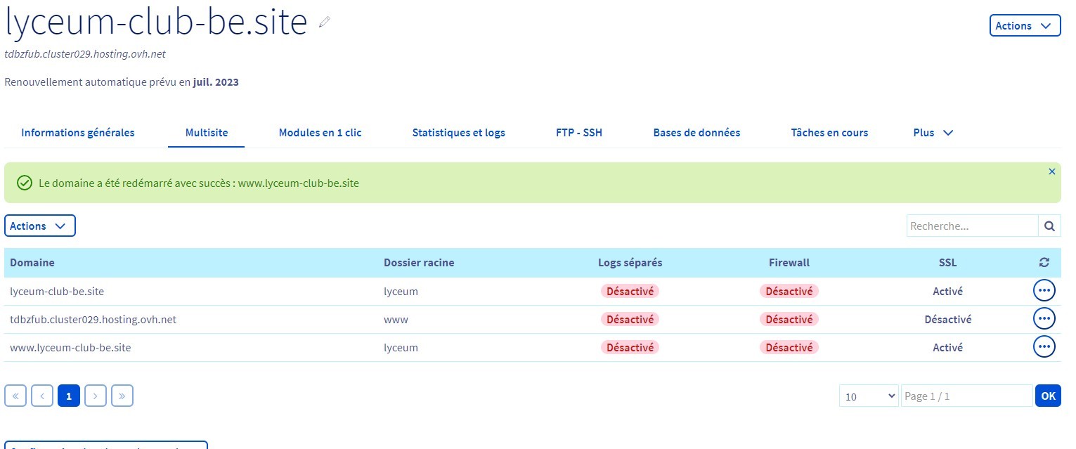 ÊDIT: j'ai triché en plaçant les fichiers web de l'asbl http://tdbzfub.cluster029.hosting.ovh.net/ sur l'espace web Perso que j'ai depuis longtemps et qui est pourtant associé à un ancien nom de domaine mais cela fonctionne. C'est tordu mais ça fonctionne. Avec le nouveau nom de domaine http://www.lyceum-club-be.site/ cela fonctionne alors que les fichiers de ce site ne sont pas à leur place. Je le vois bien avec les ftp différents des deux noms de domaines. Les fichiers placés sur le ftp du nouveau nom de domaine ne servent à rien. Je dois les placer sur le ftp de l'ancien nom de domaine mais en HTTP cela fonctionne pourtant