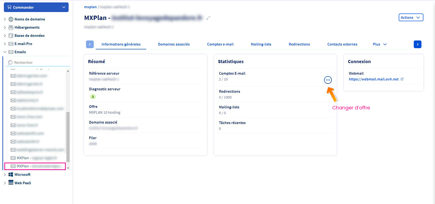 Effectivement l'option "Changer d'offre" n'est disponible que pour les items commençant par "**MXPlan**" qui sont présents dans la rubrique "Emails".