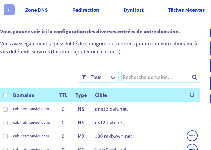 Mails chez OVH qui possède pour le nom de domaine sa propre zone DNS