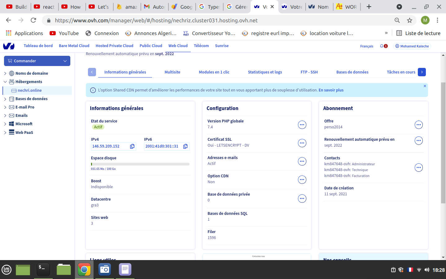 **Manager OVH > Web Cloud > Hébergement > VotreDomaine > Informations générales**