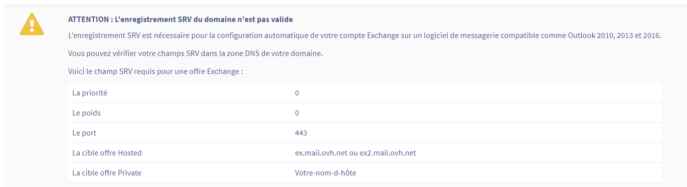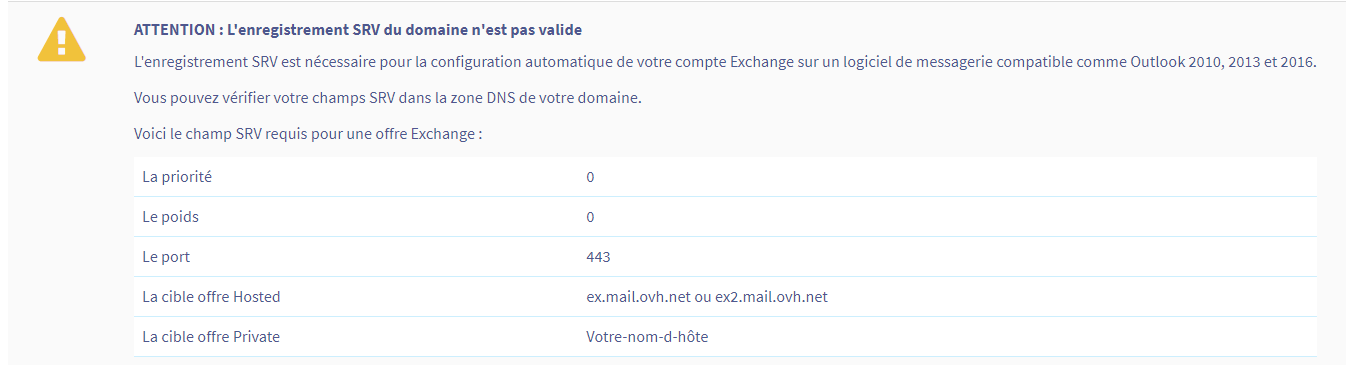 Je rencontre la problématique suivante : après avoir migré mon adresse de messagerie MXplan de chez OVH vers Exchange, toujours chez OVH, je ne peux pas procéder à la configuration de mon adresse courriel à cause du SRV qui reste en rouge dans le domaine associé. Comment puis-je faire pour que le serveur SVR soit validé et devienne vert ?